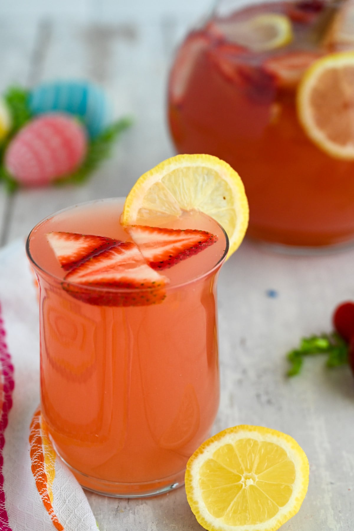 For the best presentation, garnish with sliced strawberries and lemons right before serving. If you want to make it extra cute for the kids, top each cup with a marshmallow Peep or a fun patterned paper straw for a themed Easter Bunny drink.